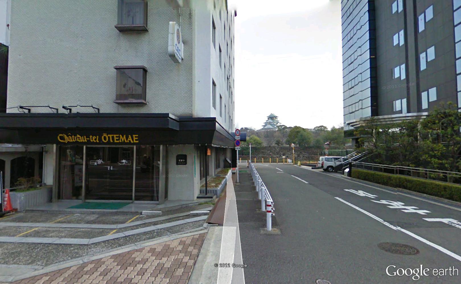 表通りから見た大阪城とロケに使われたホテル。場所がら裏側に面した部屋だと、眺めもよく静かで安めかも?