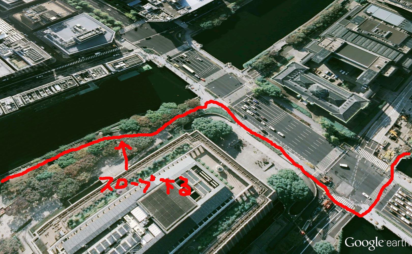 若干低くなっていてこの辺りからは見えにくくなっていますが、背景のスロープになった通路付近で二人が話しているのはココです。