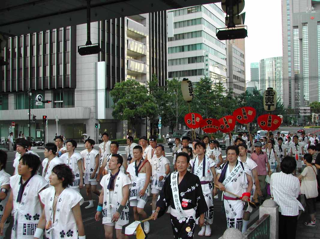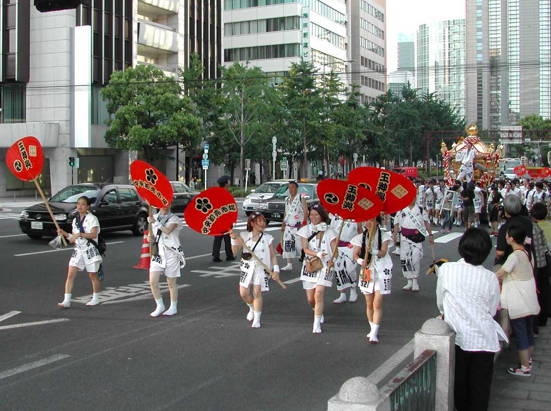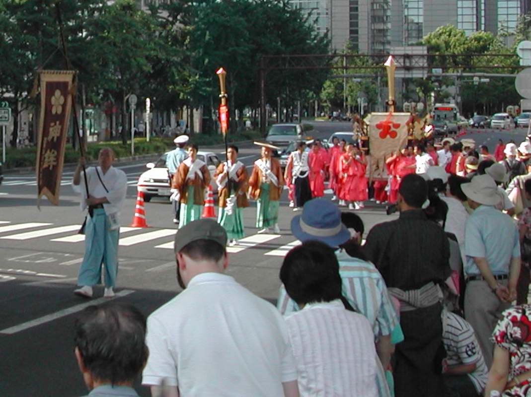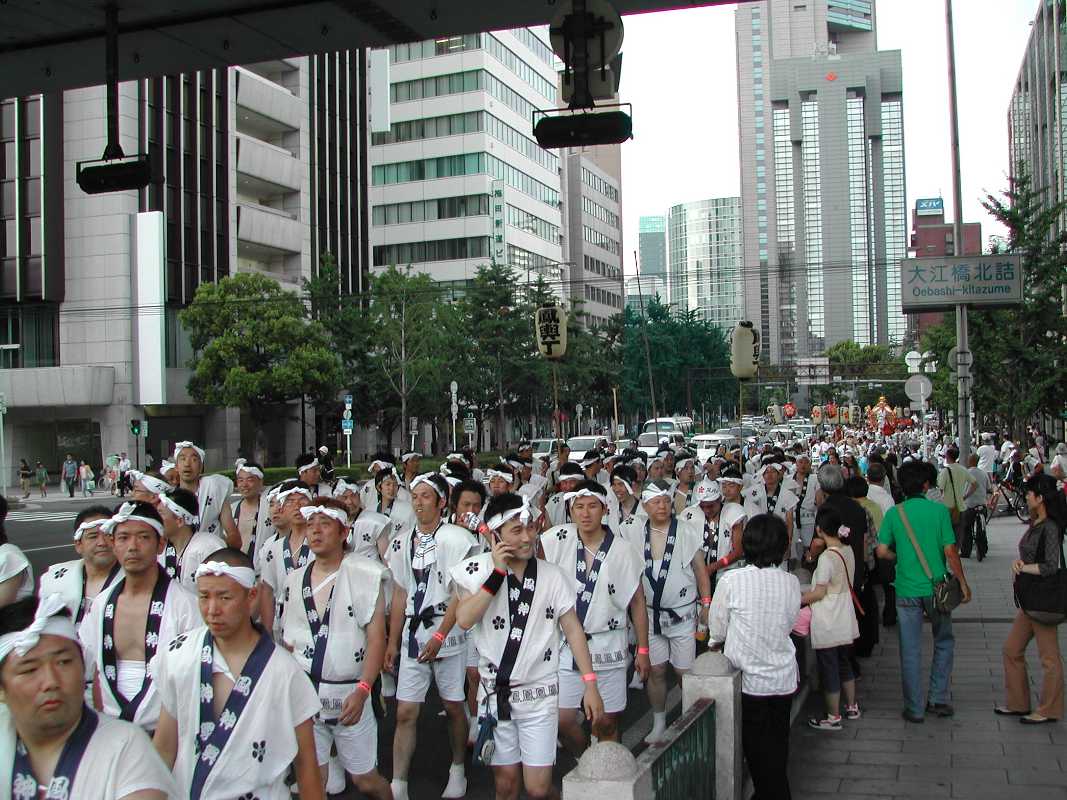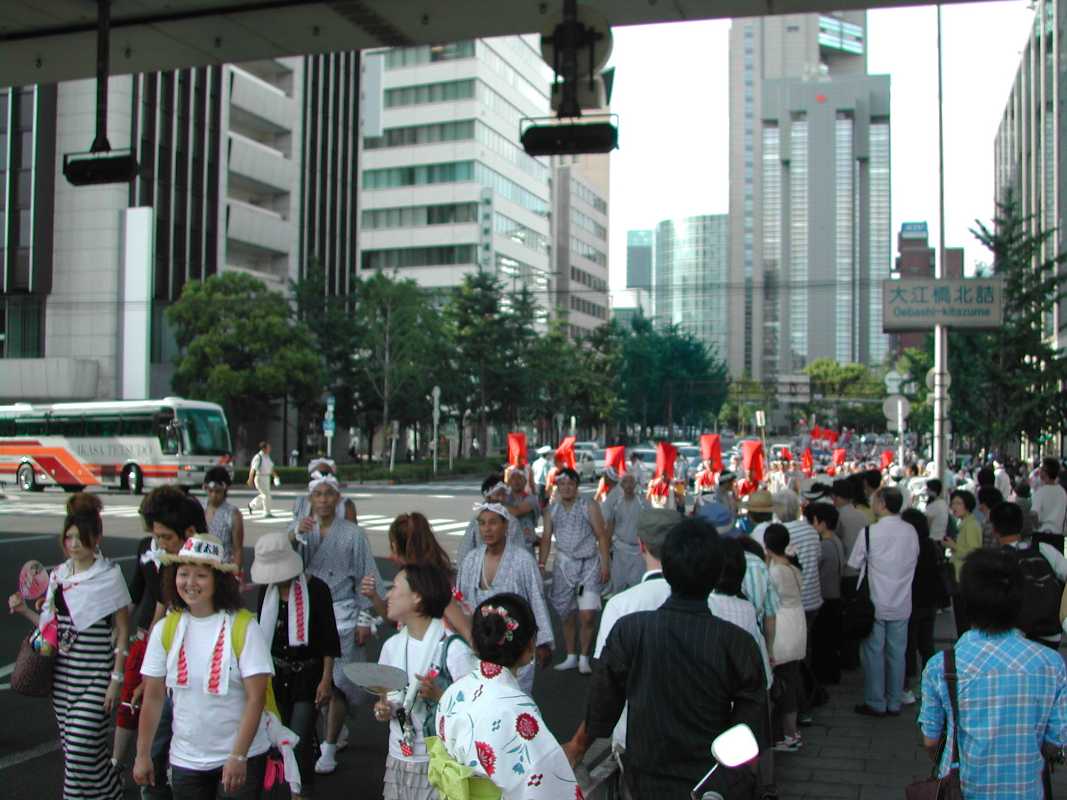 ちょうど阪神高速の下の日陰だったので休憩がてらそこにいると、天満宮付近で炭酸飲料を飲みながら見ていた行列と遭遇した!