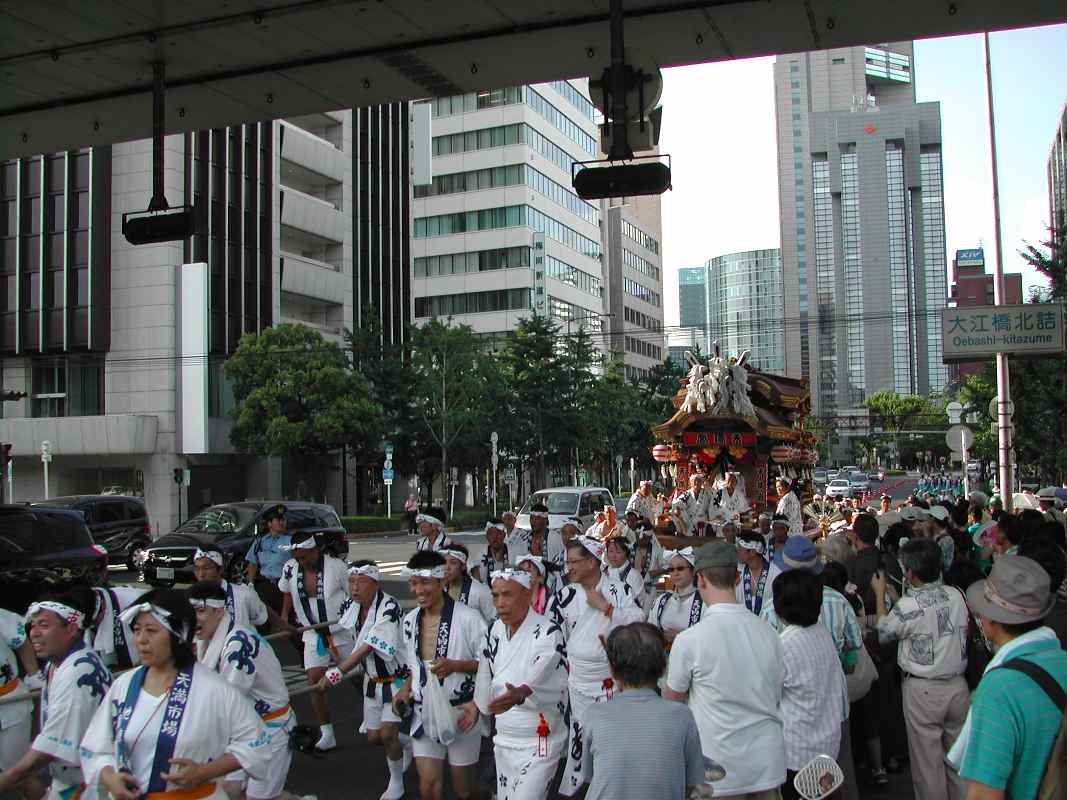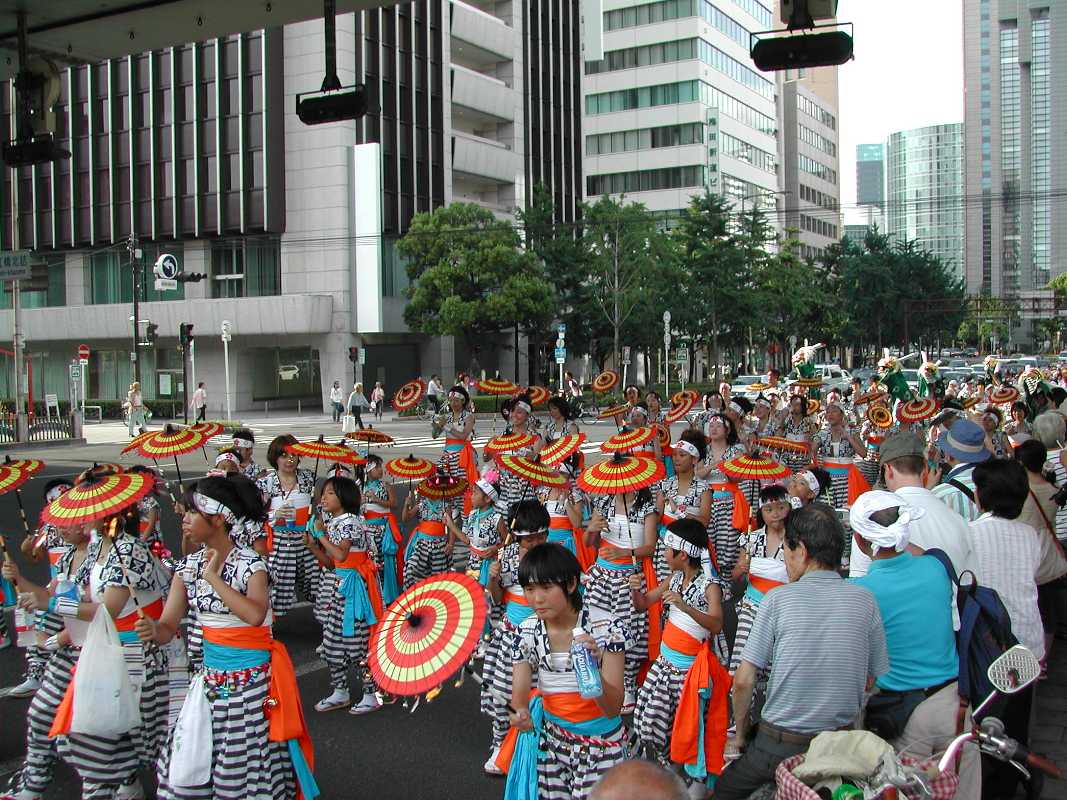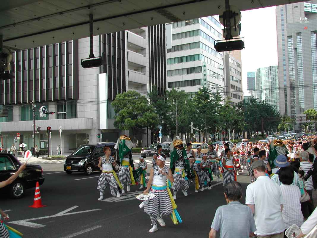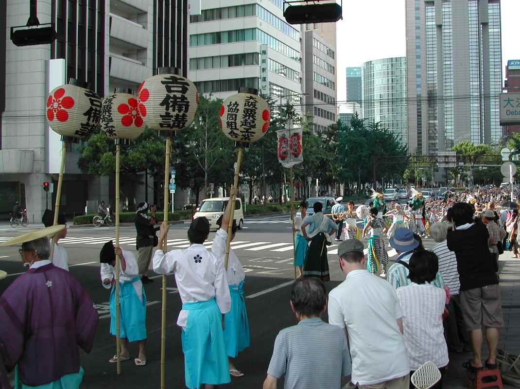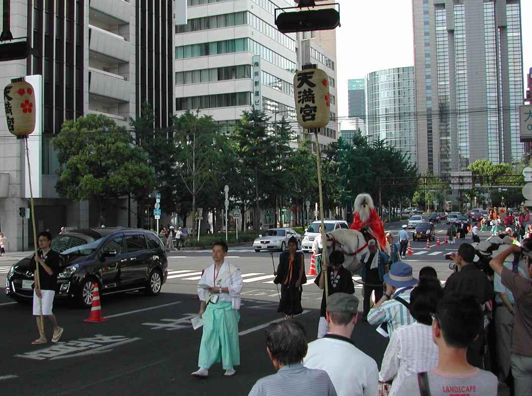 ちょうど阪神高速の下の日陰だったので休憩がてらそこにいると、天満宮付近で炭酸飲料を飲みながら見ていた行列と遭遇した!