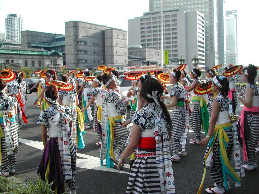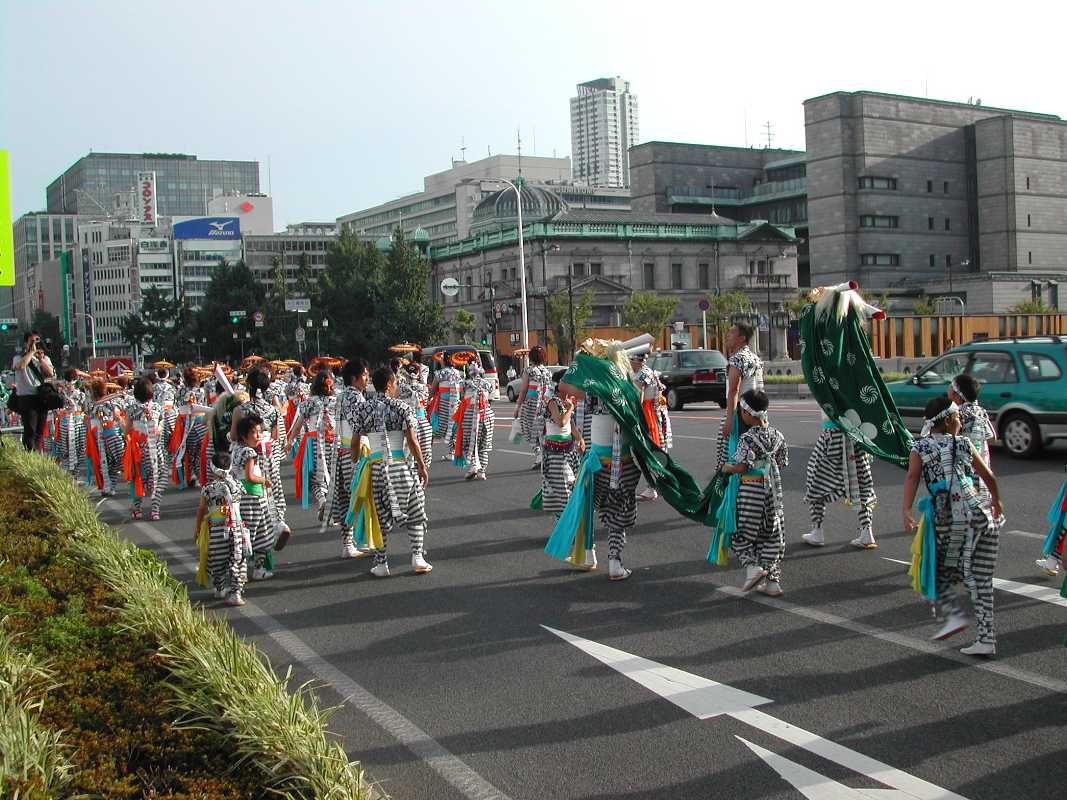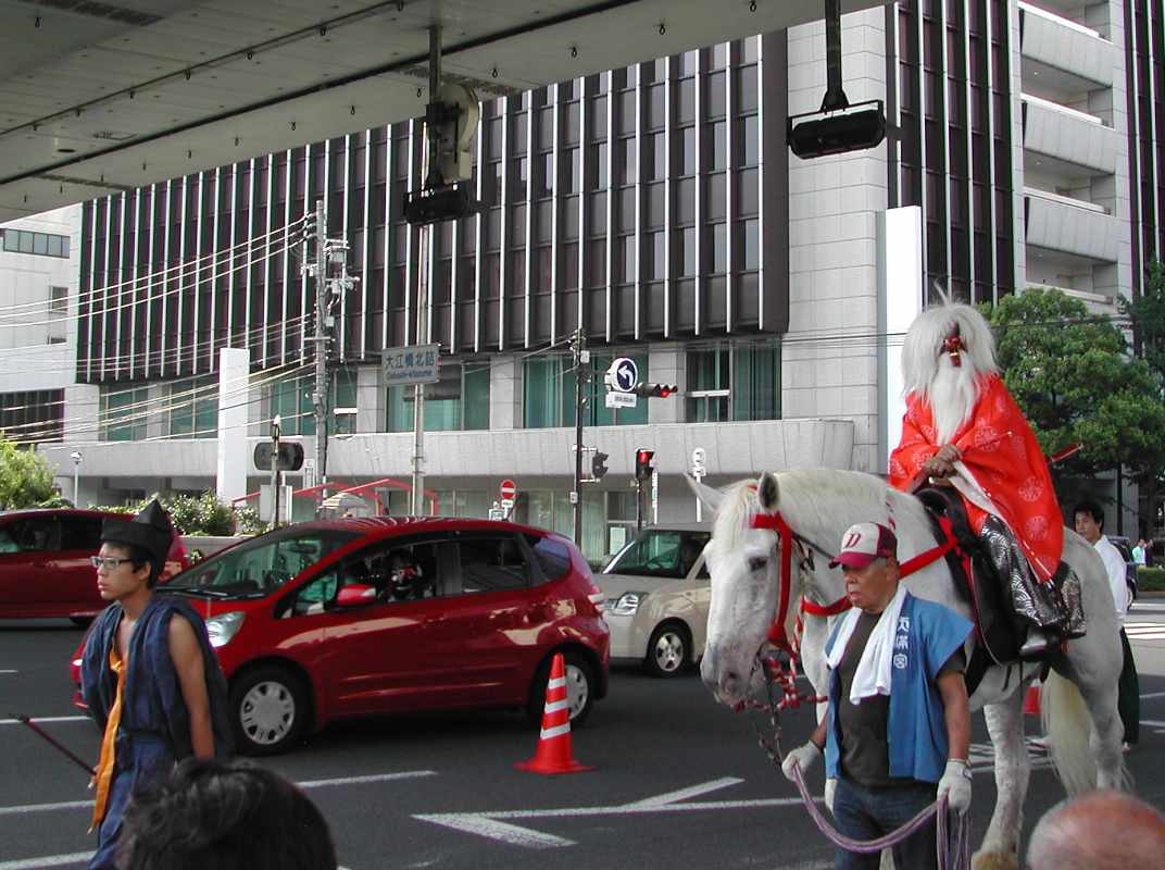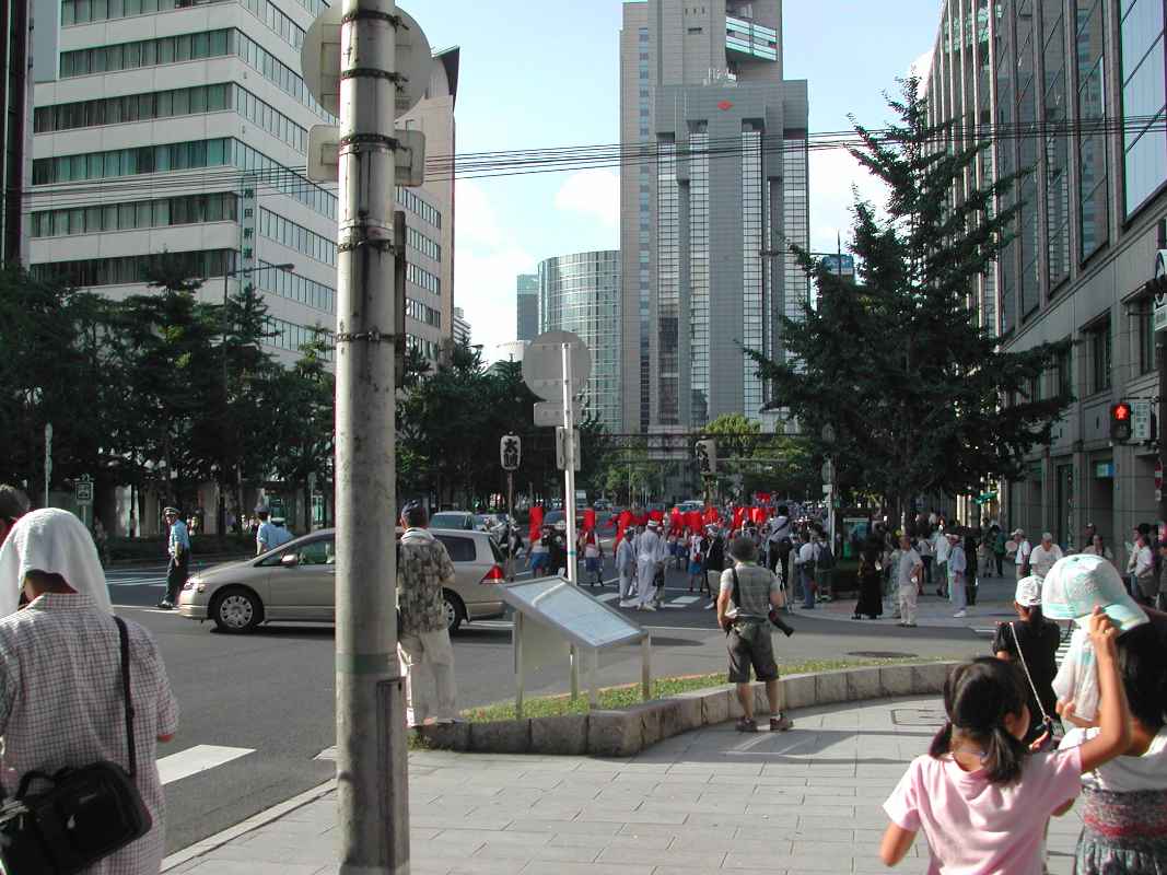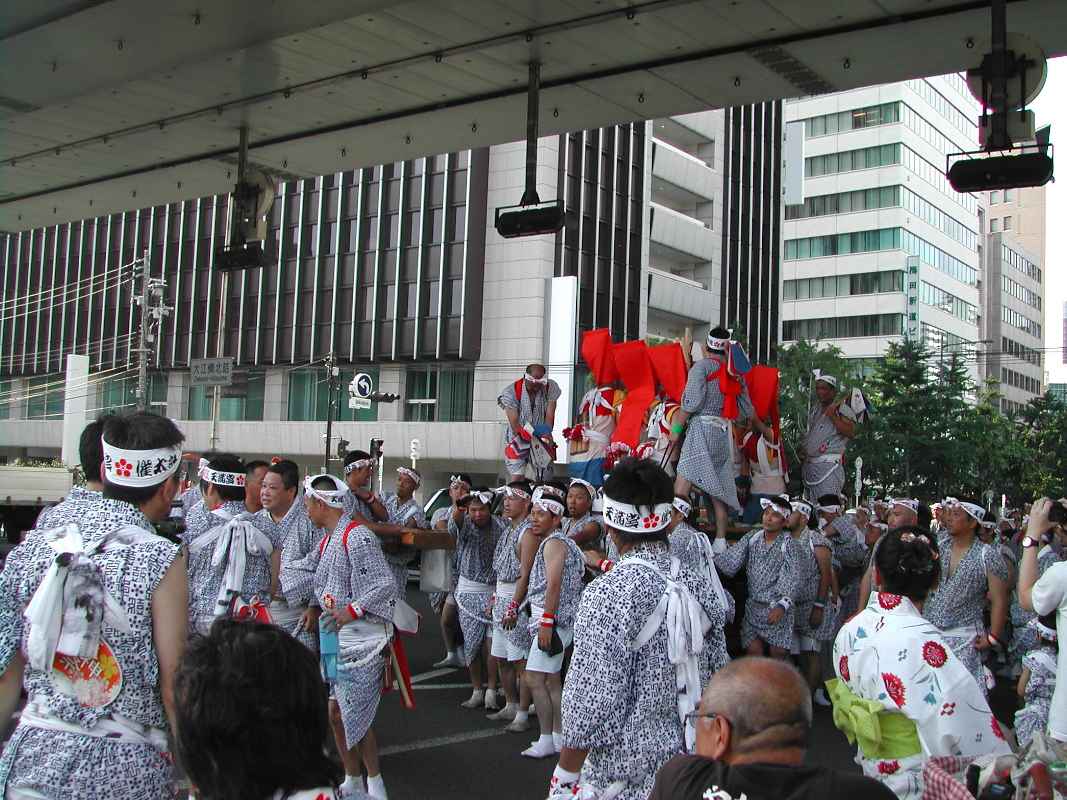 ちょうど阪神高速の下の日陰だったので休憩がてらそこにいると、天満宮付近で炭酸飲料を飲みながら見ていた行列と遭遇した!