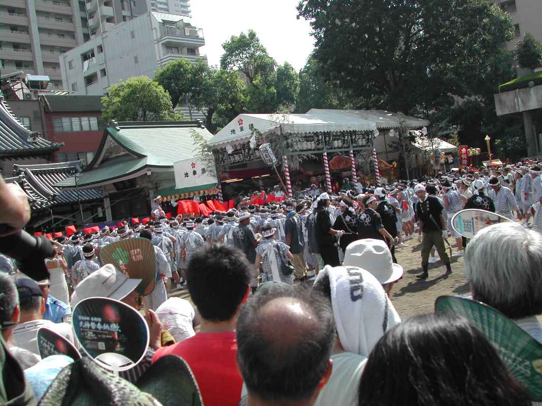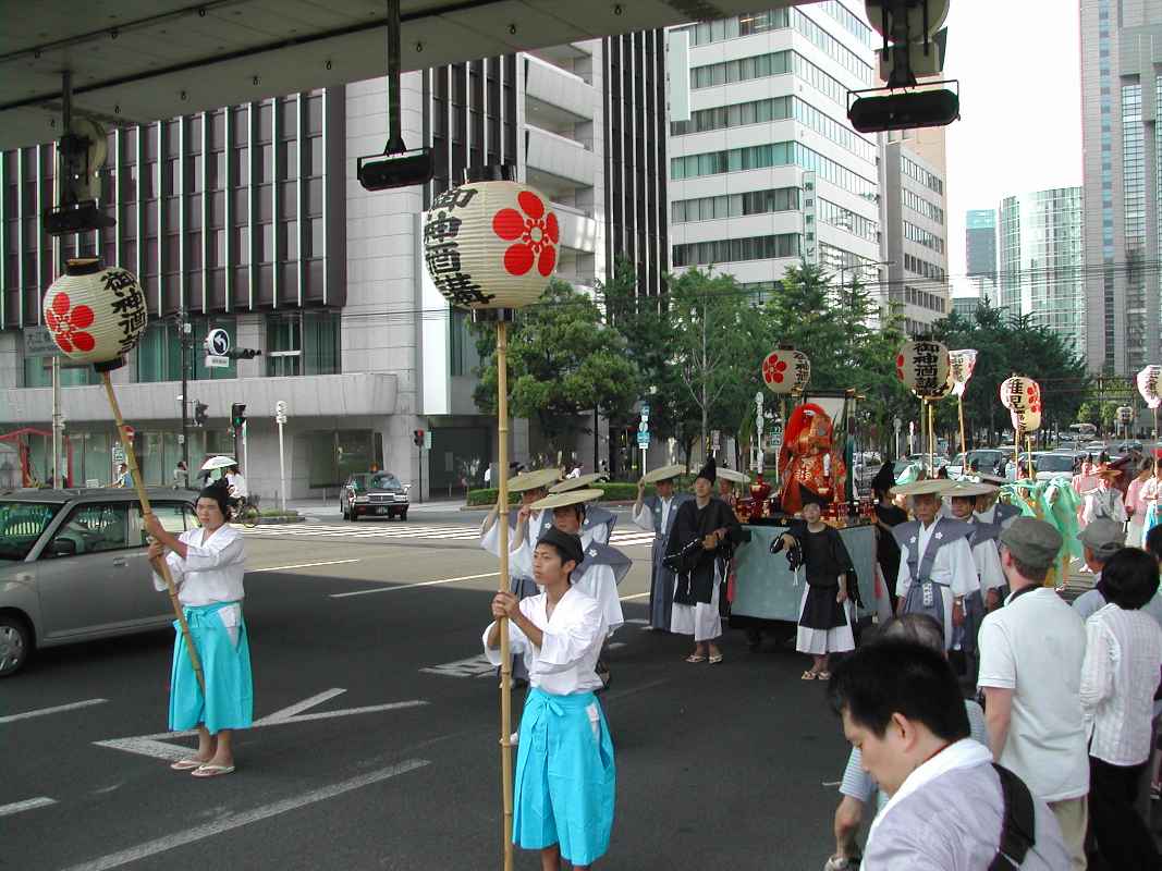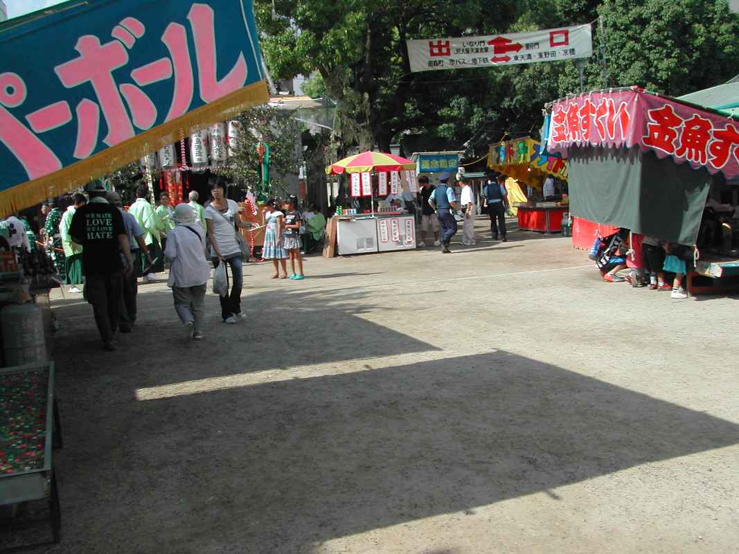 立っているだけでも暑くて先に団扇を貰いに駅前へ行き、商店街を見物しながら天神さんに戻りました。