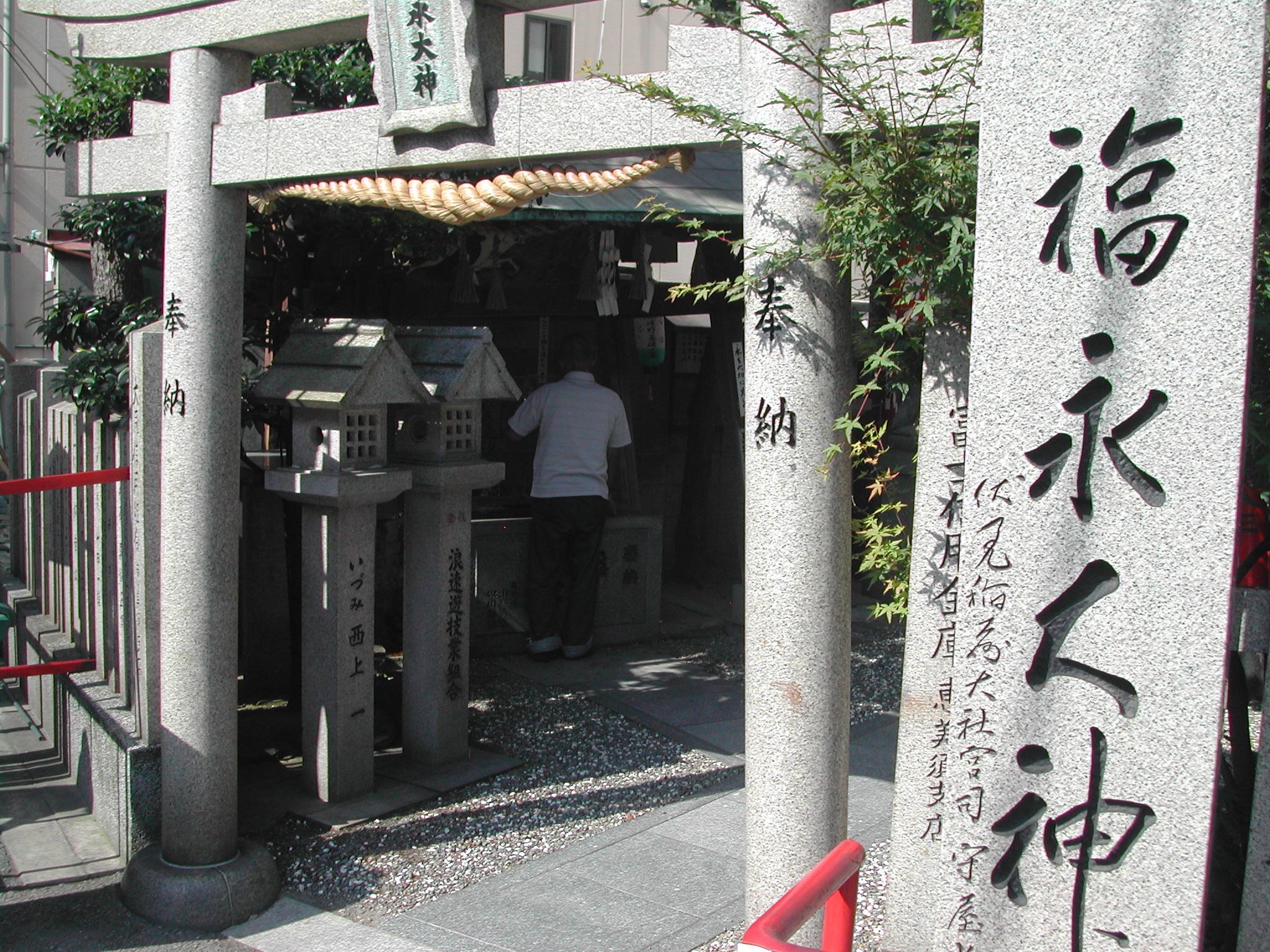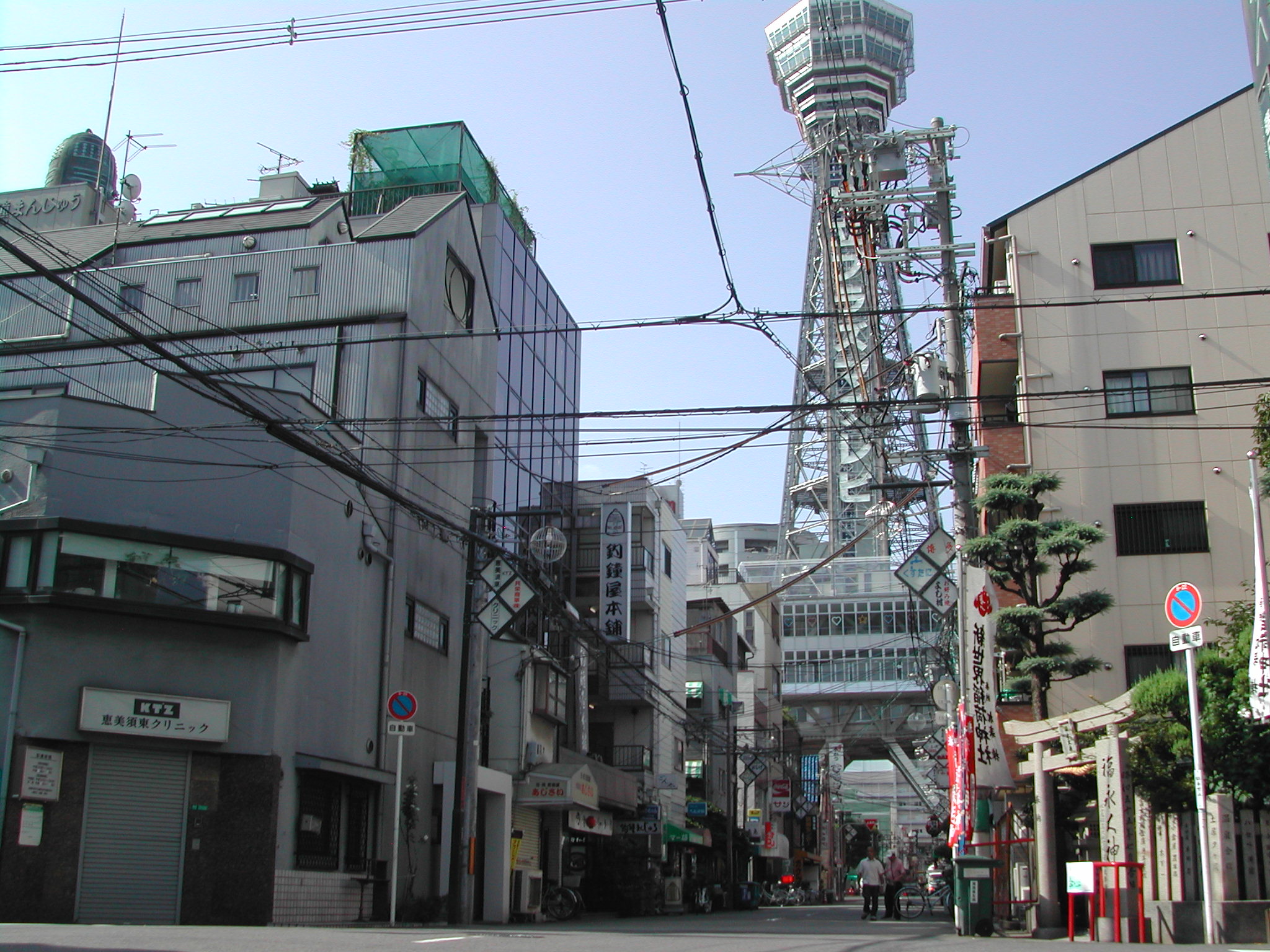 下町の風情。電線が直ぐ上にいっぱい通っている。通天閣が避雷針がわり? 神社もある。