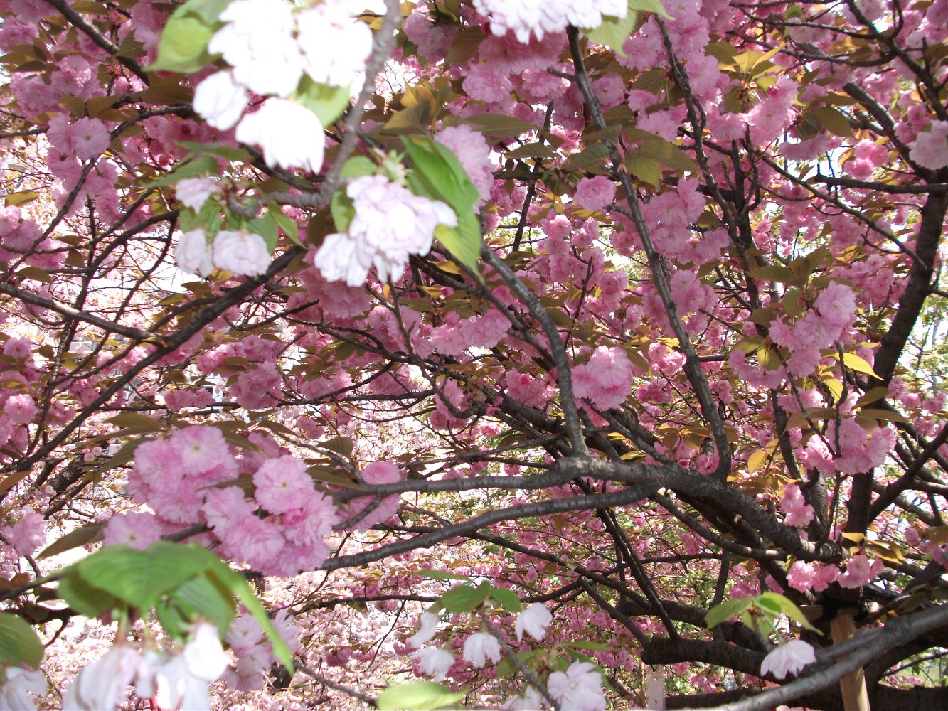 数日まえの雨によって散り始める桜もあり、これから満開の桜もあり、色違いの桜なども家の裏から観る事が出来る。