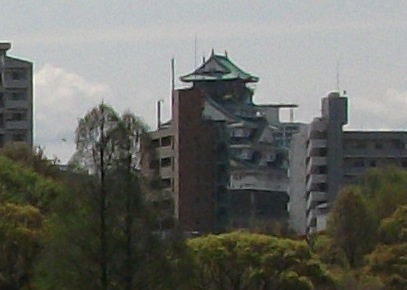 ここから大阪城はかすかに見える程度だがワンポイントだけ天守閣の石垣まで見えることに気がついた。