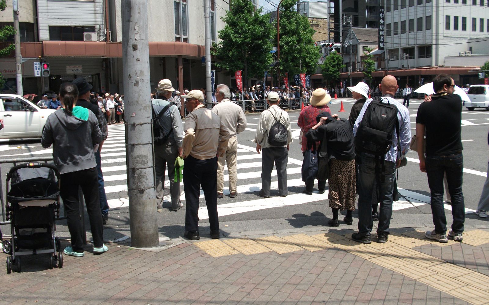 途中の横断歩道。こういう待ち方をするのは殆んど年配。おまけに交通整理の警官に文句を言う始末。