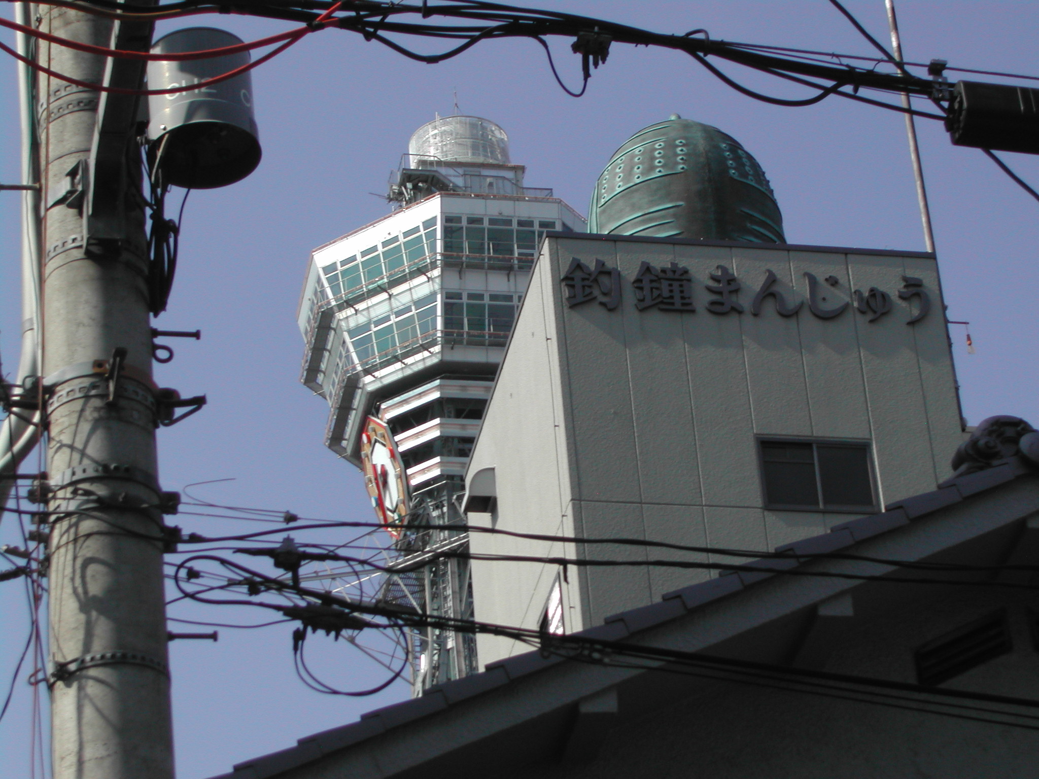 下町の風情。電線が直ぐ上にいっぱい通っている。通天閣が避雷針がわり? 神社もある。