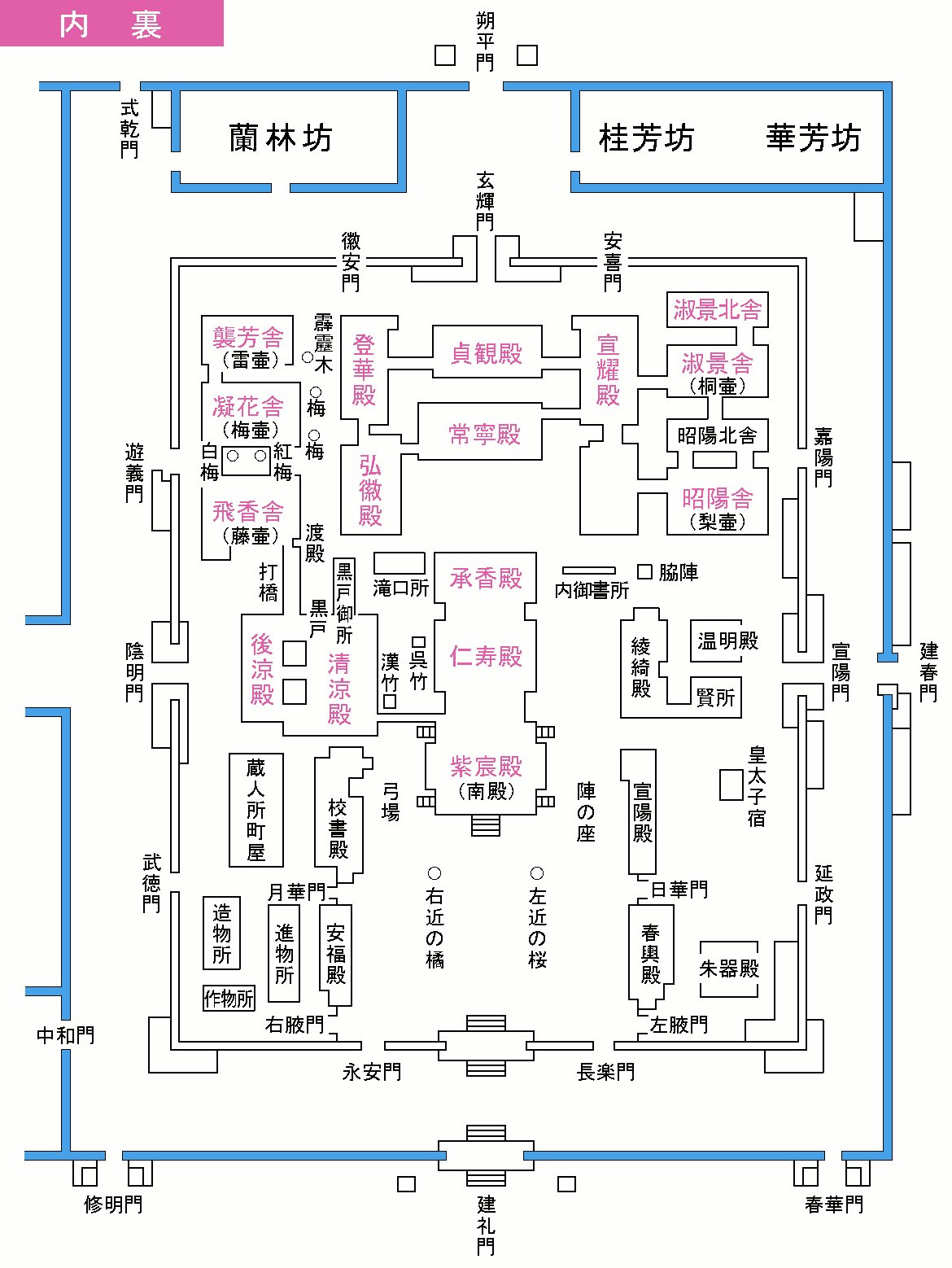 弘徽殿 (こきでん) もと皇后は常寧殿におられたが、天皇の日常起居される所が、仁寿殿から清涼殿に代わってから、皇后・中宮・女御の在所となった。 「源氏物語」の「弘徽殿の女御」は、桐壷帝の后であった。 昭陽舎(梨壷)・淑景舎(桐壷)・飛香舎(藤壷)・凝華舎(梅壷)・襲芳舎(雷の壷)などは女官がいた。