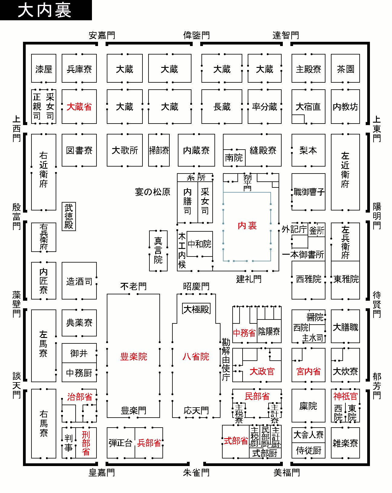 平安京の最北部中央に、東西八町 (約1.2km)、南北十町 (約1.4km)の地域を占め、その四方に十二の門を設け、南面の中央に朱雀門があった。