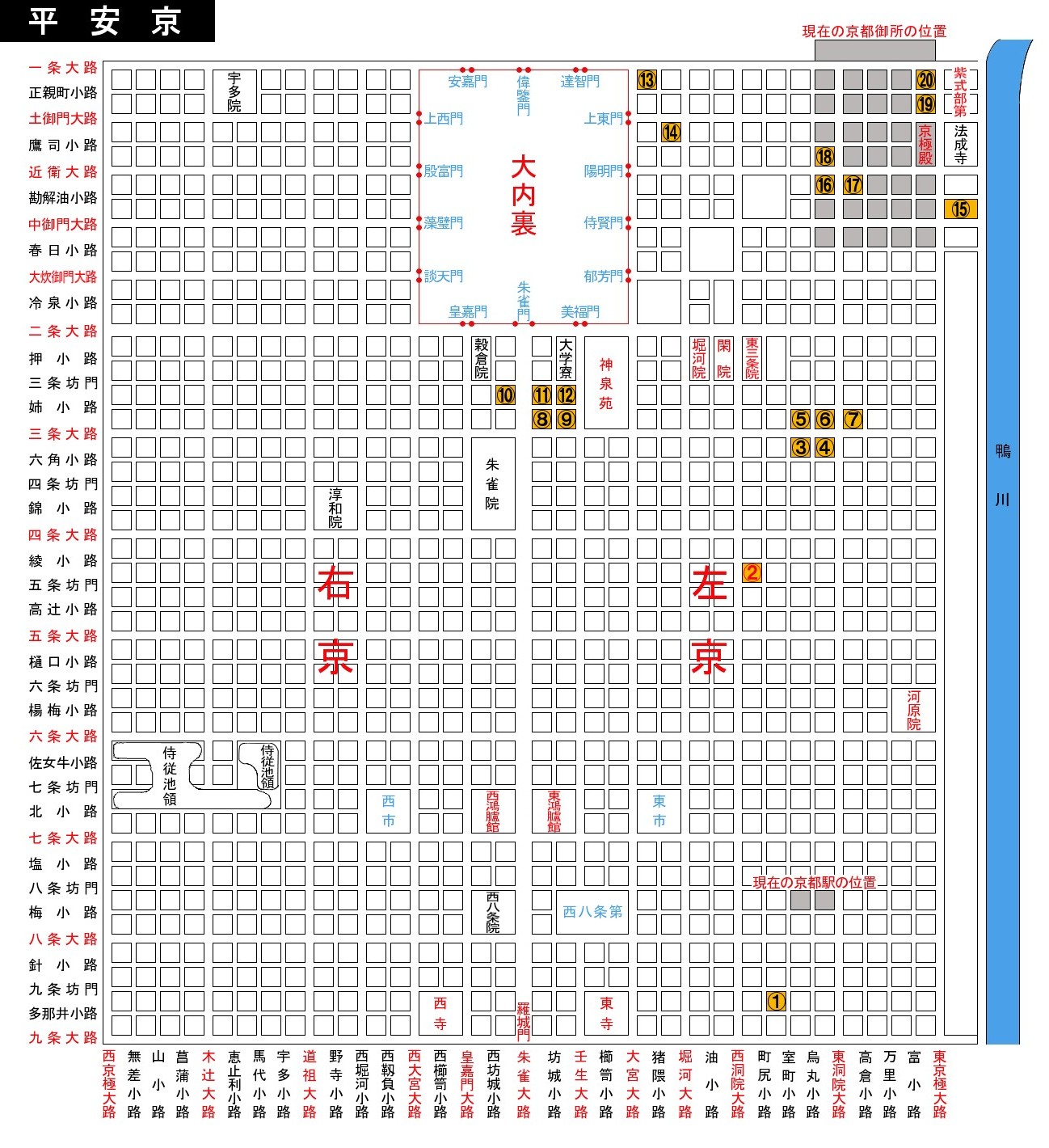 ① 九条殿 ② 紅梅殿 ③ 三条桟敷殿 ④ 六角堂 ⑤ 三条西殿 ⑥ 三条東殿 ⑦ 高倉宮 ⑧ 奨学院 ⑨ 勧学院 ⑩ 右京職