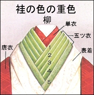 それらの色の取合せが服飾美の中心になり、色の取合せ(配色)には、着用者の人柄・教養などが反映されているものとして重視されました。