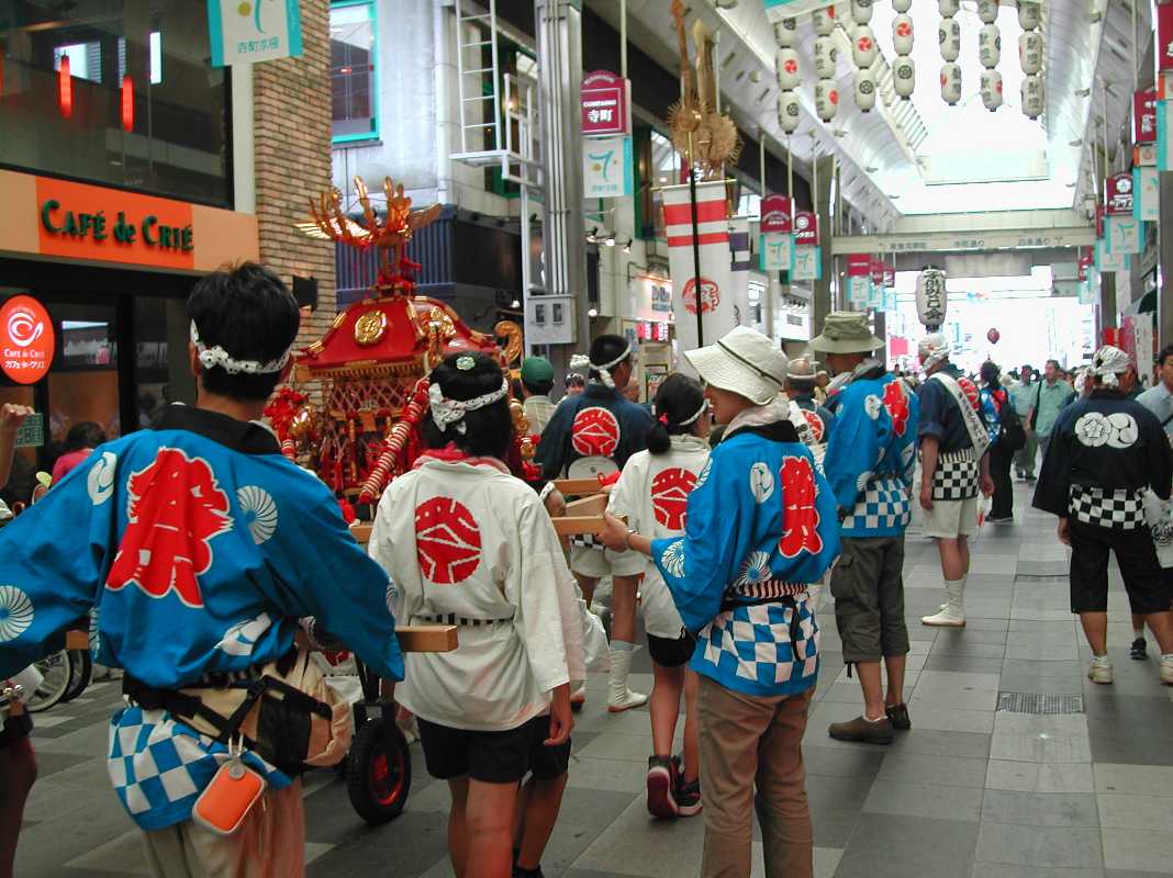 立っているだけでも暑くて先に団扇を貰いに駅前へ行き、商店街を見物しながら天神さんに戻りました。