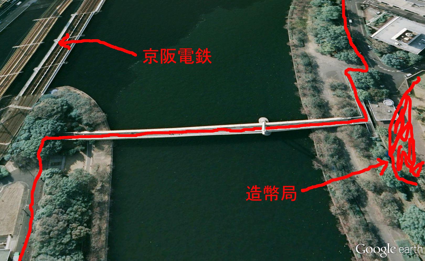 また、橋を渡らず天満橋方面から行くとなると、家をでて直ぐに人道トンネルを自転車を降りて行かなければならないので、実際の生活では若干遠回りの道順になるはずなのです。