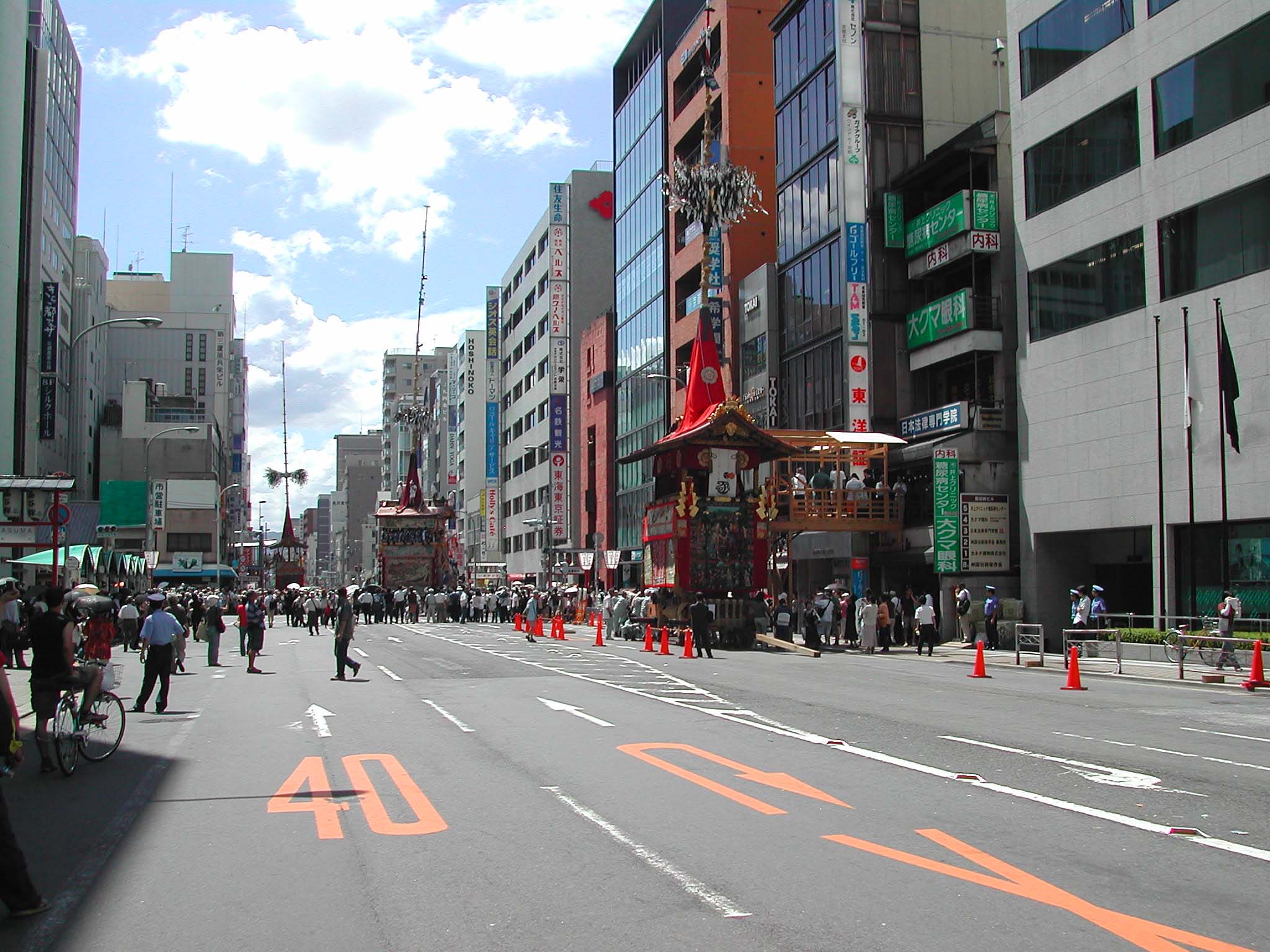 御池通りは通路も広く壁際に座ってる人、前には招待客?ところどころに露店が出ていて